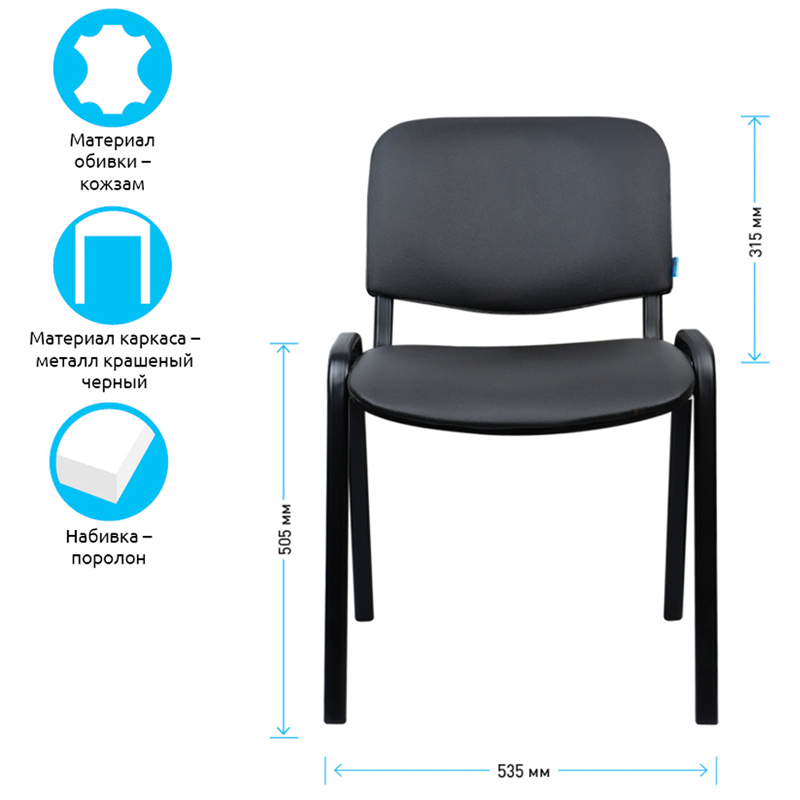 Набивка – высокоупругий поролон. Каркас – устойчивая металлическая конструкция. Ножки и дуги – плоскоовальная труба сечением 30х15 мм и толщиной стенок – 1,2 мм. Покрытие рамы – термореактивная порошковая краска чёрного цвета, стойкая к царапинам и сколам. На ножках есть пластиковые заглушки. Спинка сзади и сиденье снизу закрыты пластиковыми чехлами. Стул подходит не только для офисных помещений, но и для заведений общественного питания, гостиниц, конференц-залов или как компьютерный стул для дома. Конструкция каркаса позволяет убирать стулья в стопки для экономии пространства.