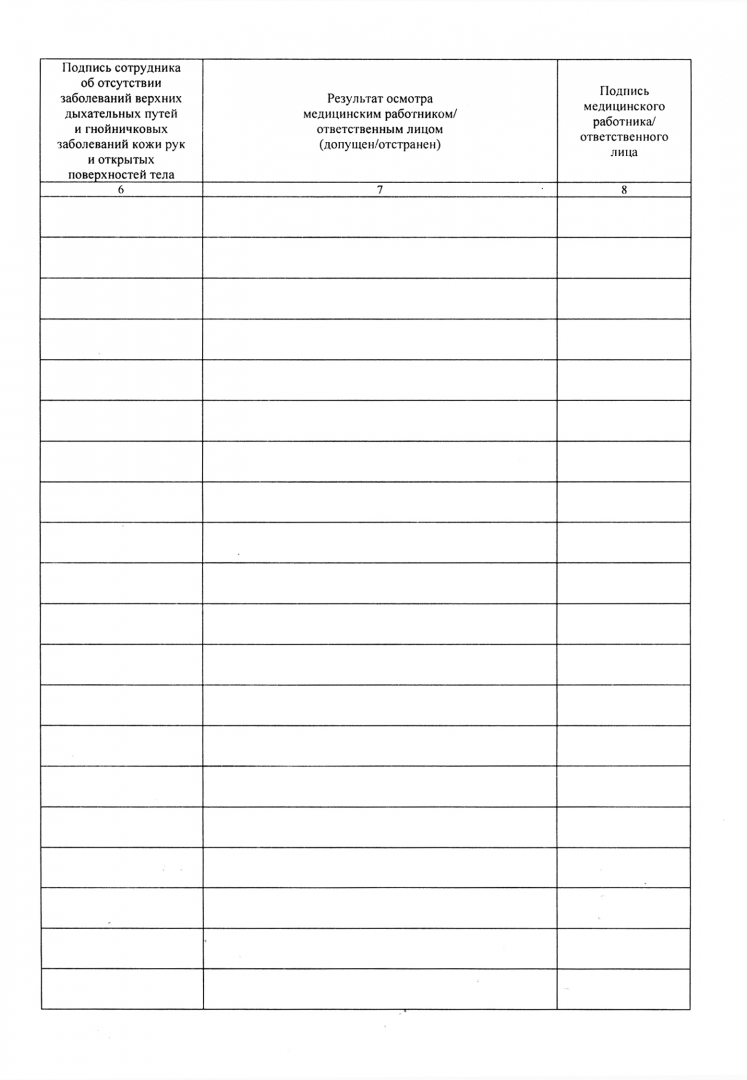 Медицинский сотрудник (или назначенное ответственное лицо предприятия общественного питания) должен проводить ежедневный осмотр работников, занятых изготовлением продукции общественного питания, и работников, непосредственно контактирующих с пищевой продукцией, в том числе с продовольственным сырьем, на наличие гнойничковых заболеваний кожи рук и открытых поверхностей тела, признаков инфекционных заболеваний. Результаты осмотра в обязательном порядке заносятся в гигиенический журнал в соответствующие графы: № п/п, дата, Ф.И.О. работника (последнее - при наличии), должность, подпись сотрудника об отсутствии признаков инфекционных заболеваний у сотрудника и членов семьи, подпись сотрудника об отсутствии заболеваний верхних дыхательных путей и гнойничковых заболеваний кожи рук и открытых поверхностей тела, результат осмотра медицинским работником (ответственным лицом) (допущен/отстранен); подпись медицинского работника (ответственного лица).